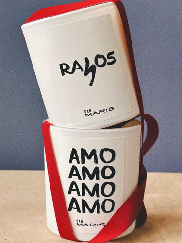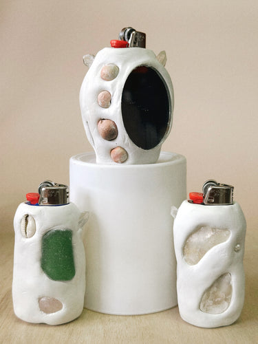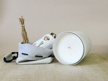 Each set includes a handcrafted lighter talisman, a white leather pouch, a luxury San Maris candle, an affirmation card, and an ethically sourced Haitian vetiver bundle.
