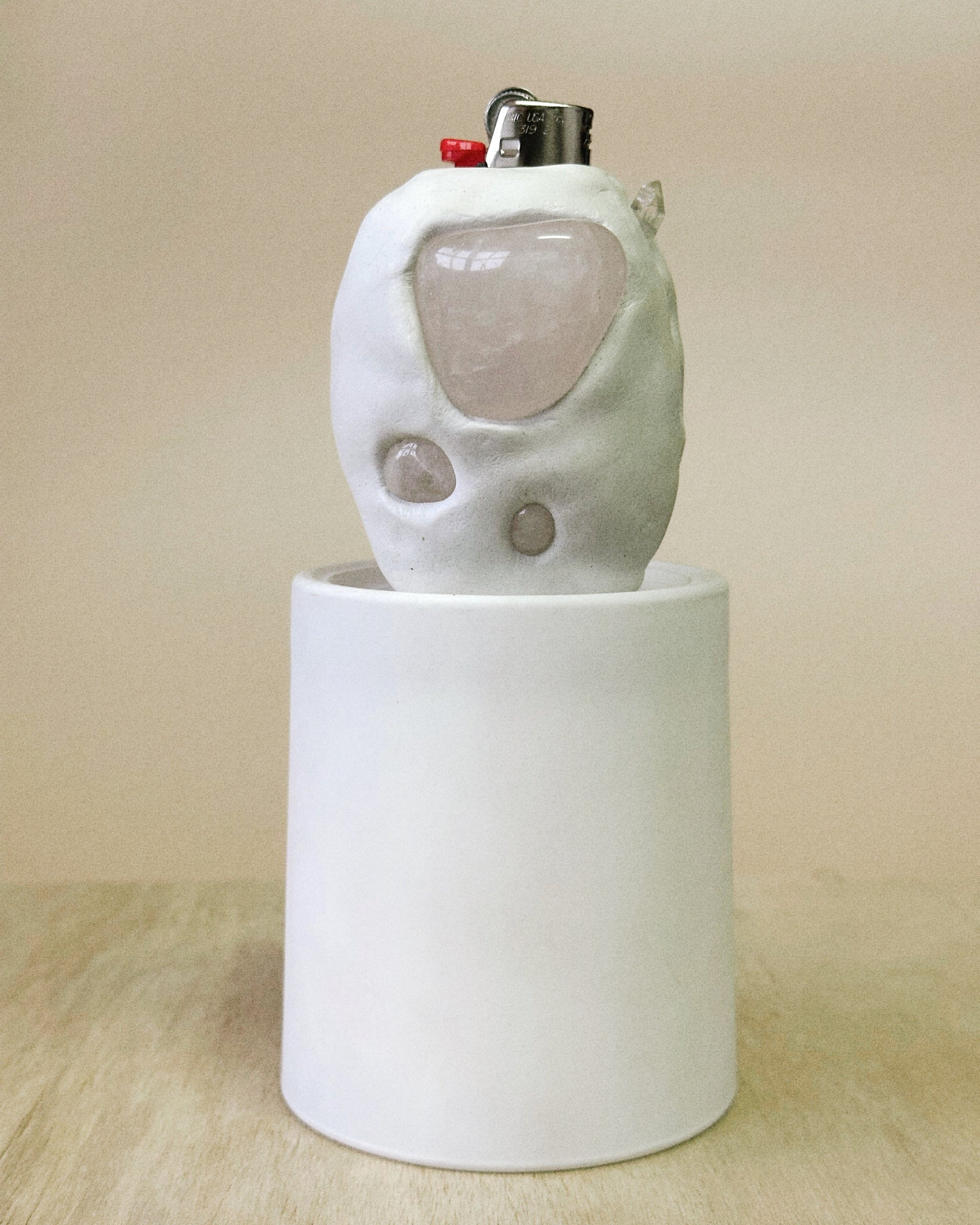 White ceramic lighter on beige back drop with Rose Quartz