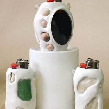 This altar lighter embodies her luminous energy with a mirror for reflection and self-awareness, clay beads for grounded devotion, opal for inspiration and emotional healing, clear quartz points for clarity and amplified intention, tumbled bubble quartz for gentle radiance, cowrie shells for prosperity and protection, and agate for harmony and balance.